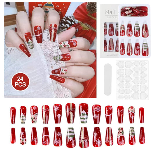 24 uñas postizas de Navidad, uñas cortas a presión, de cobertura completa, con 24 pestañas adhesivas