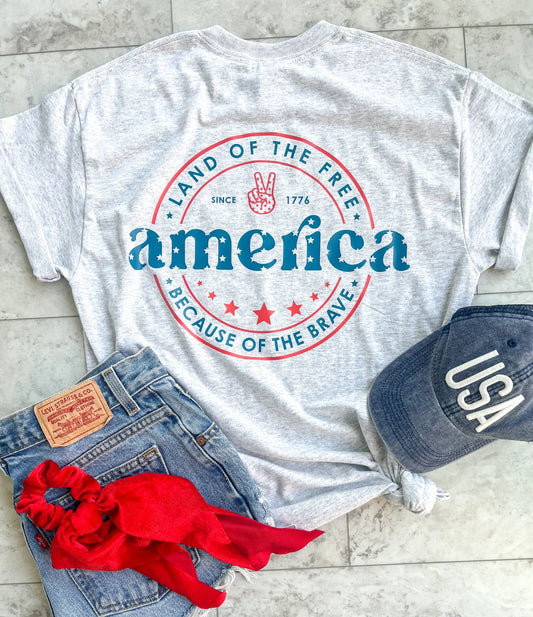 Camiseta supersuave con el símbolo de la paz en el bolsillo frontal del pecho y el logo retro americano en la espalda. La camiseta está preencogida y sus colores vibrantes no se destiñen.- talla 2XL