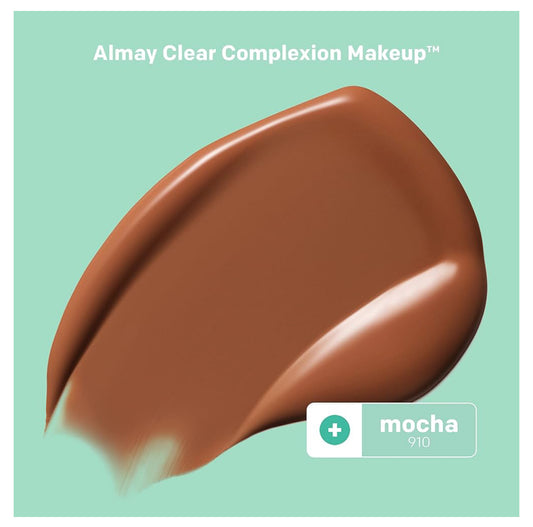 Almay Clear Complexion - Base de maquillaje para acné con ácido salicílico, ligero, cobertura media, hipoalergénico, sin fragancia, para pieles sensibles, moca 910, 1 onza líquida.-Color: 910 Mocha