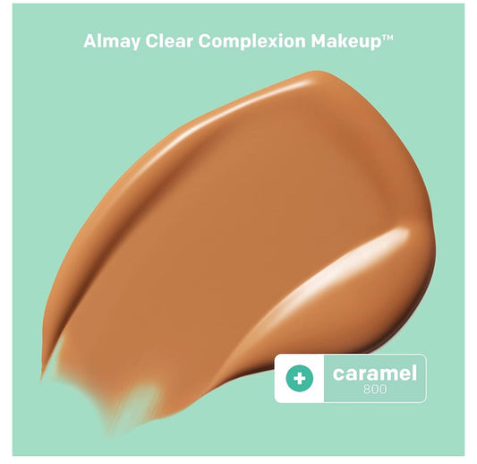 Almay Clear Complexion - Base de maquillaje para acné con ácido salicílico, ligero, cobertura media, hipoalergénico, sin fragancia, para pieles sensibles, 800 caramelo, 1 onza líquida.-Color: 800 Caramelo Bronceado