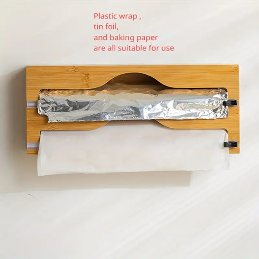 Dispensador de envoltura de cocina 2 en 1 de bambú con cortador - Soporte para rollo de papel film adherente, papel aluminio o papel para hornear montable en pared, caja organizadora de almacenamiento seguro para contacto con alimentos