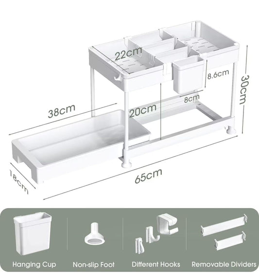 SPACEKEEPER Organizador para debajo del fregadero, organizador de cesta deslizante de 2 niveles para debajo del baño, estante de almacenamiento con ganchos, taza colgante, divisores, disponible en blanco