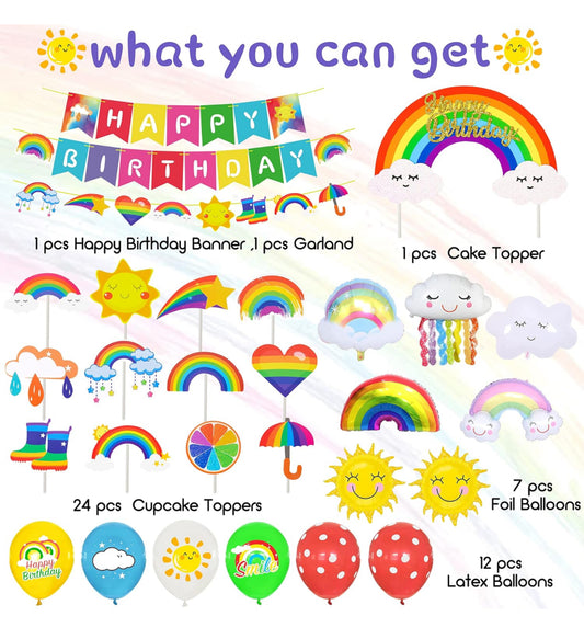 Juego de 48 piezas de decoración de fiesta de arco iris, pancarta de feliz cumpleaños, arco iris, decoración de cupcakes, globos de látex de aluminio arcoíris para suministros de fiesta de cumpleaños arcoíris