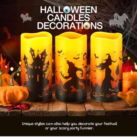 Velas LED sin llama de Halloween, 3 unidades, decoración de Halloween, funciona con pilas, juego de 3 velas rústicas de pilar de cera real con brujas, hombres lobo, murciélagos, castillos, bosques