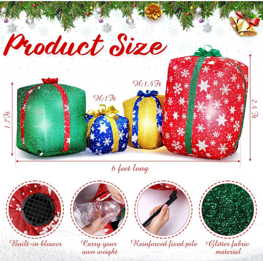4 cajas de regalo inflables gigantes con purpurina de 6 pies iluminadas para decoración al aire libre, cajas de regalo de Navidad gigantes con soplador automático, cajas de regalo