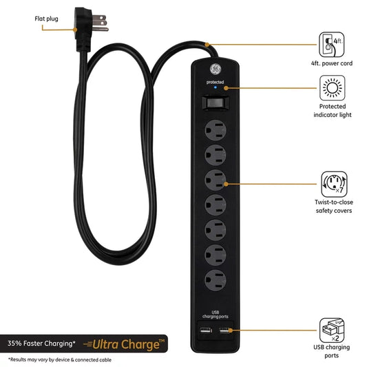 Protector contra sobretensiones de la regleta de alimentación de 7 salidas y 2 puertos USB GE UltraPro, 4 pies, negro, 40482