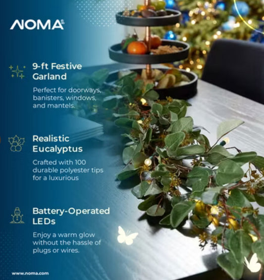 NOMA Guirnalda navideña de eucalipto flocado con LED preiluminado de 9 pies Decoración navideña con luces que funcionan con pilas, 35 luces blancas cálidas, 100 puntas de pino