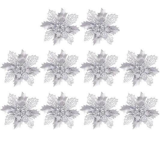 10 flores artificiales de Navidad de flor de pascua, lentejuelas con purpurina, adornos para árbol de Navidad, decoraciones de flor de pascua para boda, fiesta, corona de 6.3 in, color plateado