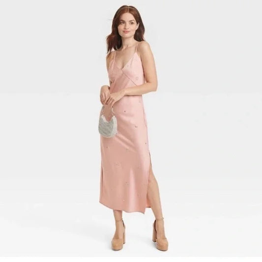 Vestido midi lencero de satén rosa ruborizado de A New Day, adornado con una gran gema de diamantes de imitación. talla L