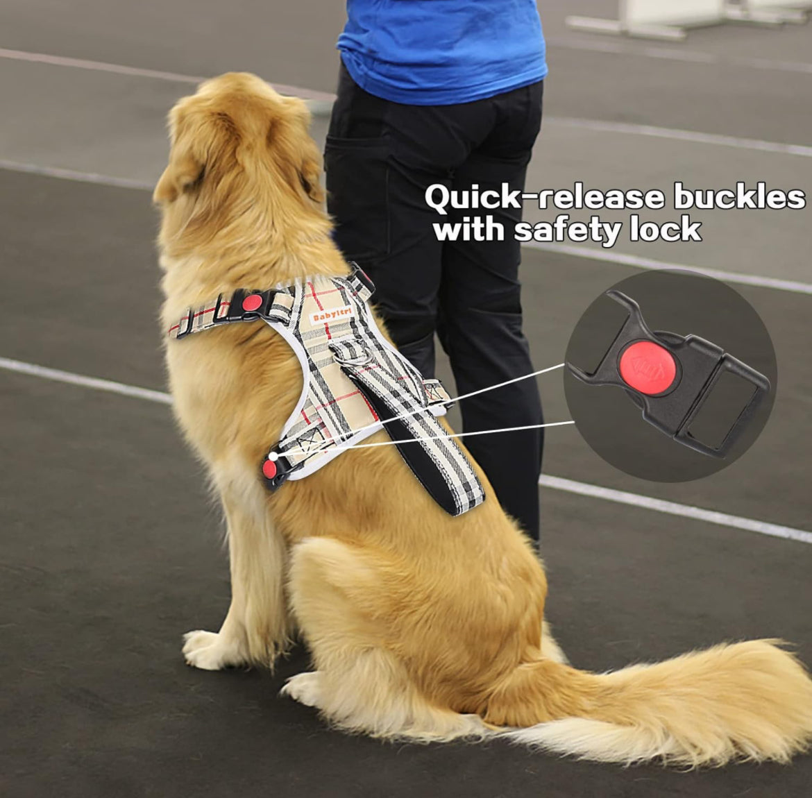 Arnés sin tirones para perro, con correa y cuello, arnés ajustable de chaleco reflectante Oxford sin estrangulamiento, arnés suave para perros pequeños, medianos y grandes, arnés de fácil control (caqui a cuadros, L)