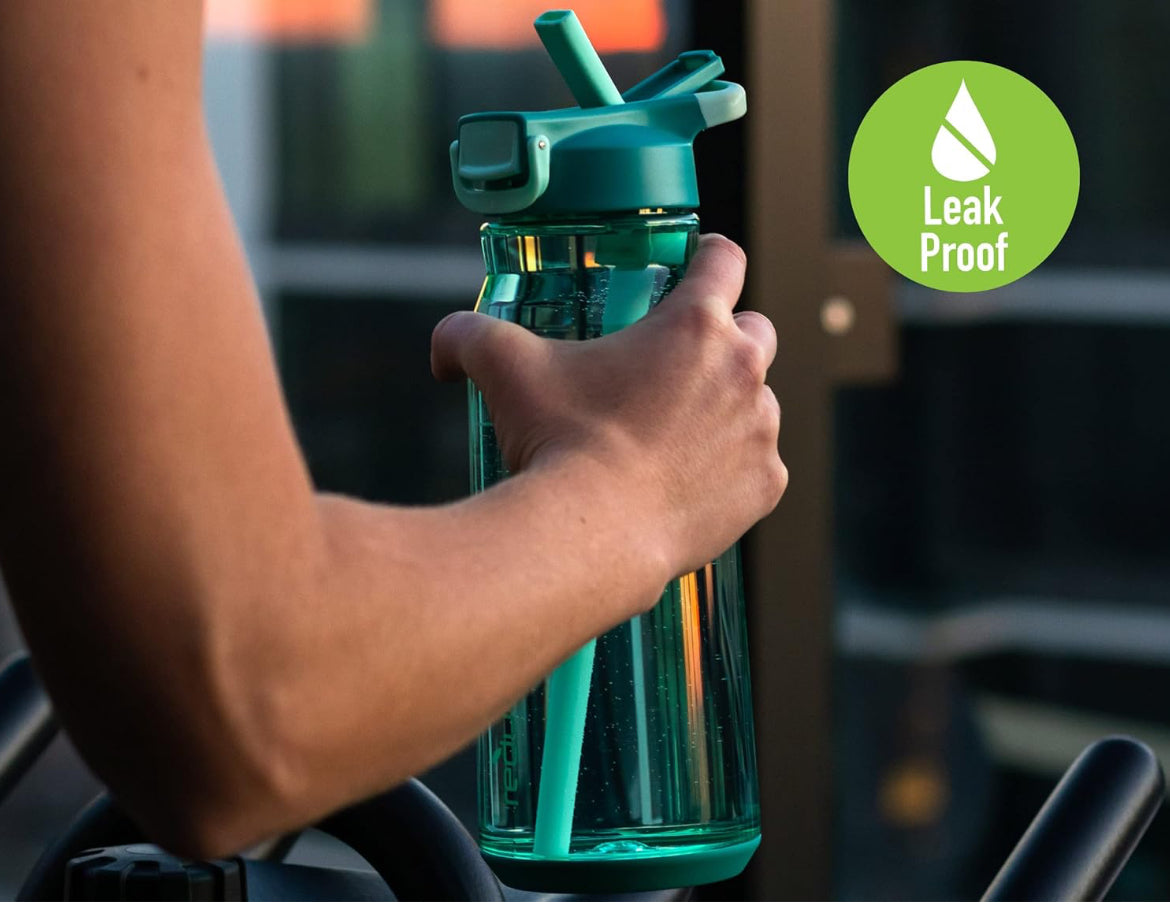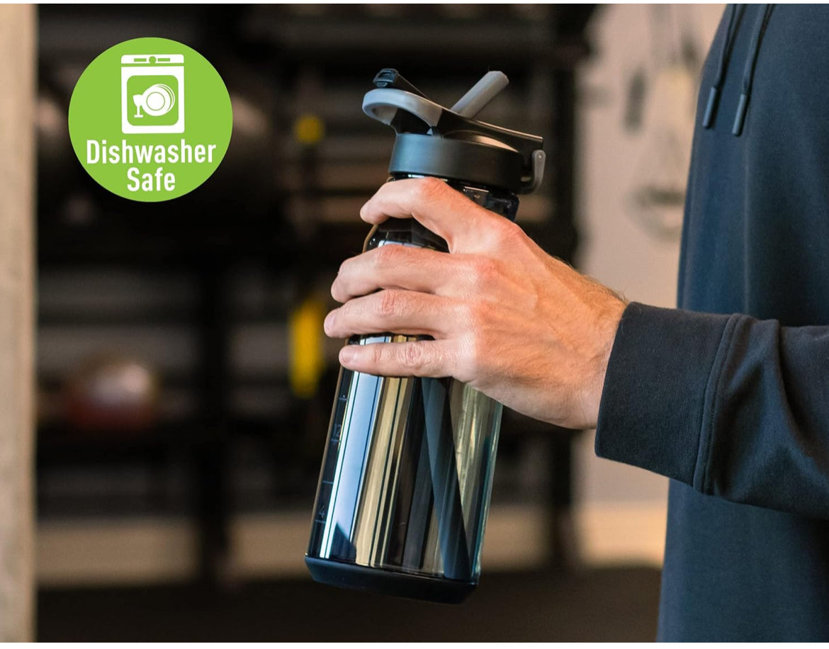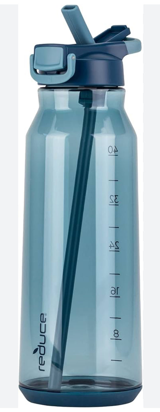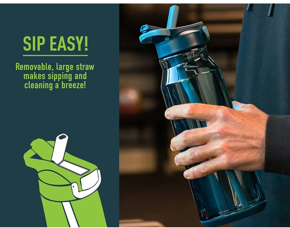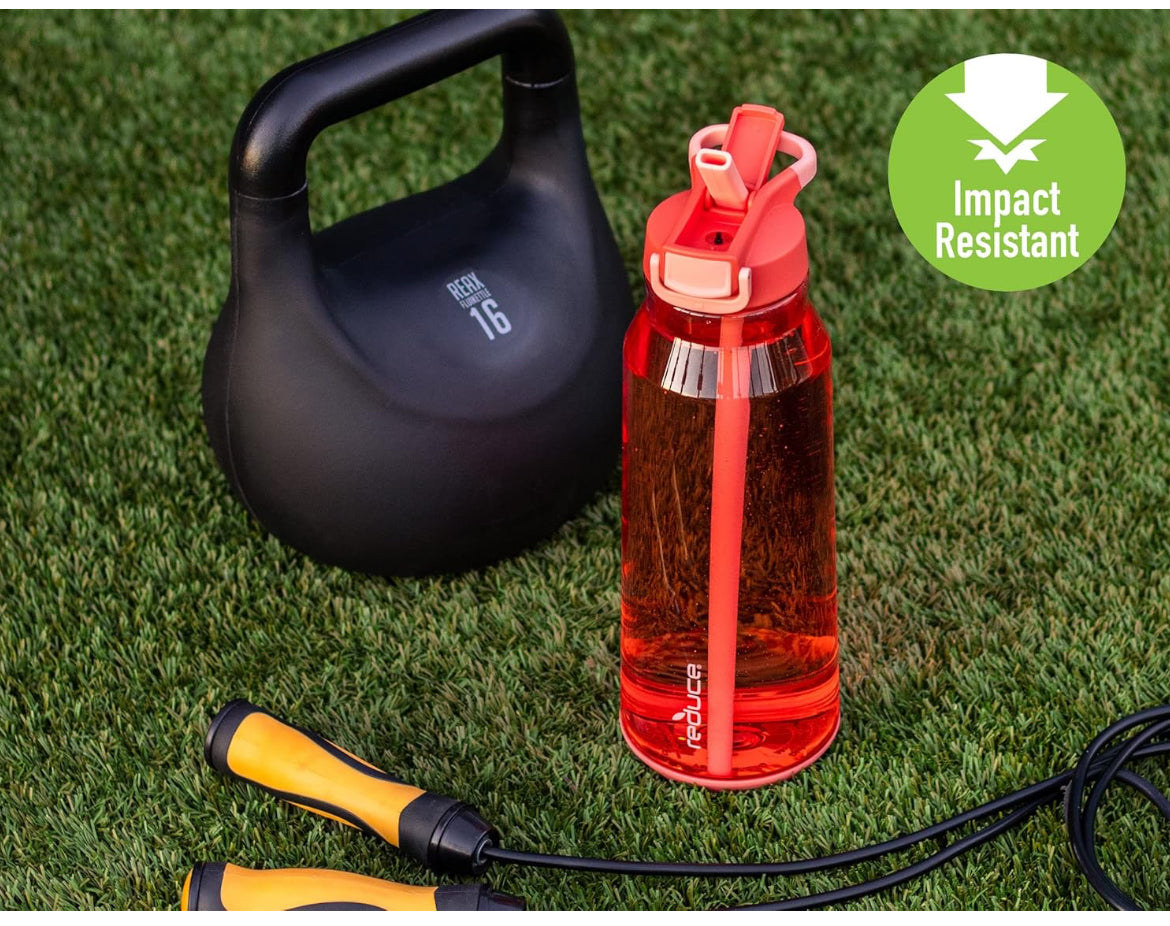 Botella de agua REDUCE - Botella de agua hidratante, 50 oz - Tapa abatible higiénica, pajilla integrada y asa de transporte - A prueba de fugas, compatible con portavasos - Flip, Sip and Go - Dark Web, Tritan Plastic