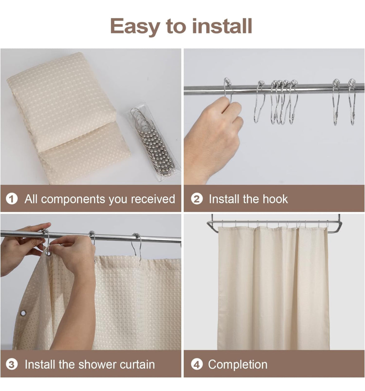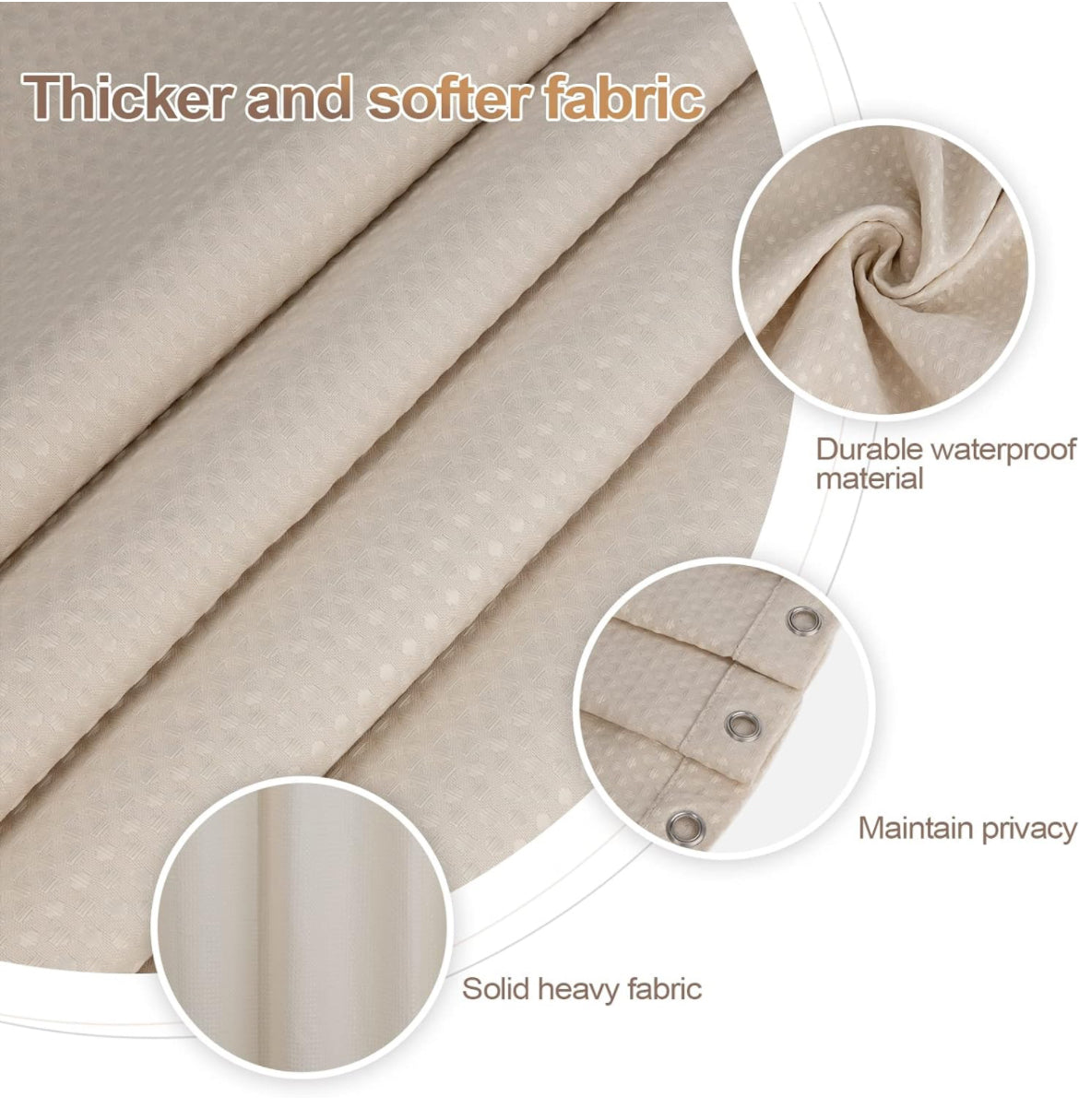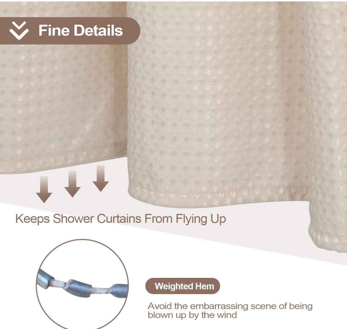 Cortina de ducha de tela gofre, impermeable, tamaño de ducha de 72 x 72 pulgadas, con 12 ganchos, dobladillo largo pesado, lavable a máquina, adecuado para el hogar, hotel, baño, juego de cortinas de baño