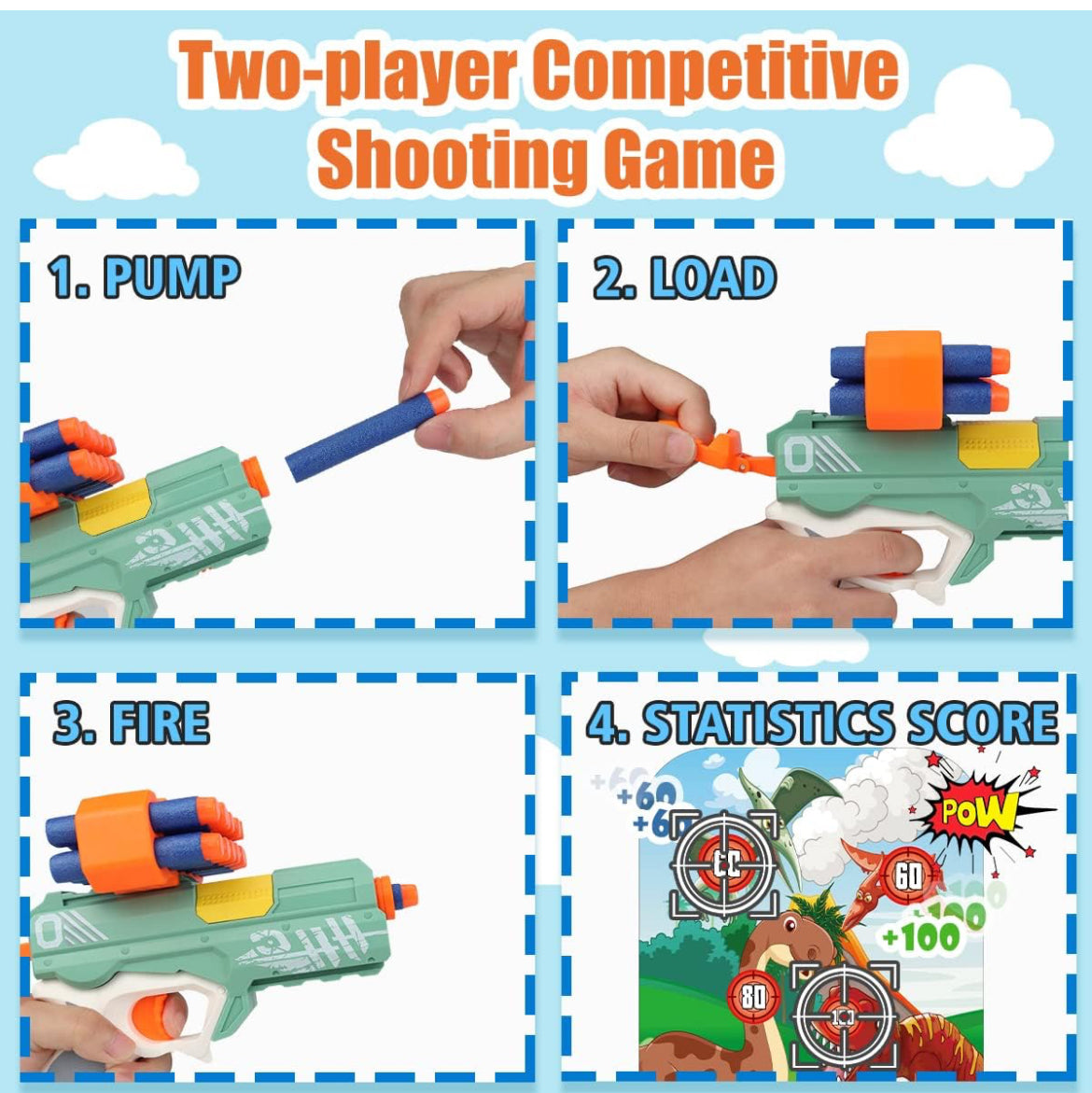 Juego de disparos de dinosaurios para niños de 5 a 10 años, objetivo de doble cara con 2 lanzadores de dardos de espuma y 40 dardos, juguetes de pistola para exteriores y regalos