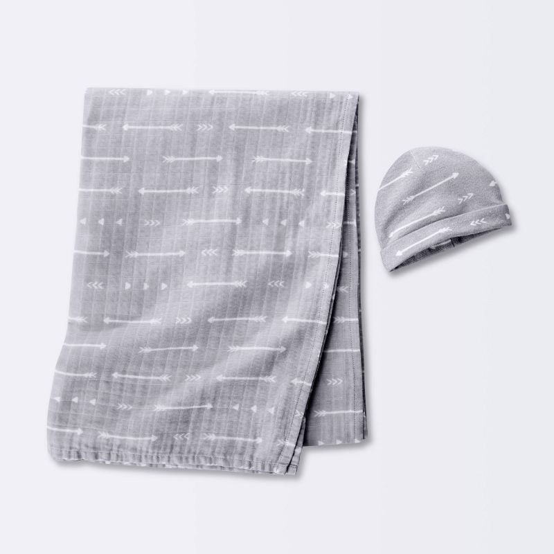 Juego de regalo de manta y gorro de bebé con envoltura de muselina del hospital - Flecha gris - 2 piezas - Cloud Island™